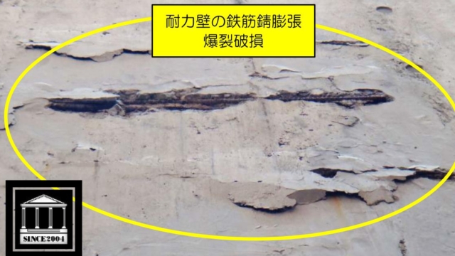RC造耐力壁の欠陥事例 鉄筋コンクリート造耐力壁の鉄筋かぶり厚さ不足に伴うコンクリートの爆裂破損事例写真です。 コンクリートの中性化進行に伴い、鉄筋かぶり厚さ(コンクリート外面と鉄筋までの被覆厚さ)に不足が存している場合、鉄…Read More 構造劣化耐力壁欠陥RC構造欠陥