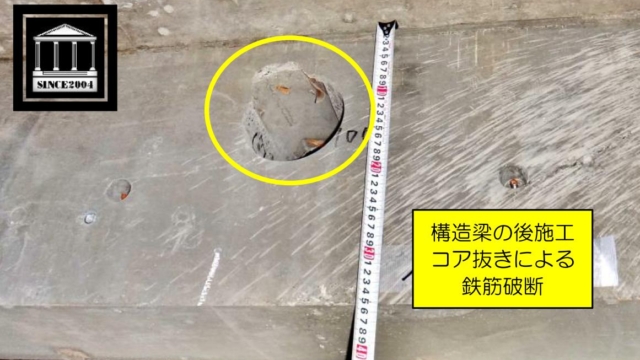 RC構造施工瑕疵事例 鉄筋コンクリート造、共同住宅の施工瑕疵事例写真です。 設備配管用のコア抜き時に、鉄筋を破断しています。 RC建物に対して、後施工のコア抜きを行う場合、非破壊検査により鉄筋の位置を把握したうえで、破断が…Read More RC構造欠陥