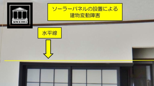 ソーラーパネル設置による建物変動障害事例 ソーラーパネルの設置により1階天井が下がった事例写真です。 構造強度(安全性)を確認せず、ソーラーパネルを屋根上に設置し、2階床梁にタワミ変動が生じた結果、2階床傾斜や1階和室引戸の作動不良が生じてい…Read More 設備工事欠陥