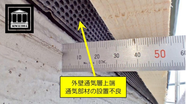 外壁通気層部材の設置欠陥事例 外壁通気層工法、上端通気部材の設置不良事例写真です。 上端の通気部材と外装材に隙間が生じている場合、強風降雨(降雪)時に、通気層内部に雨水(雪)が吹き込むため、通気部材の設置強度に注意が必要です。 特…Read More 外壁欠陥屋根漏水・浸水