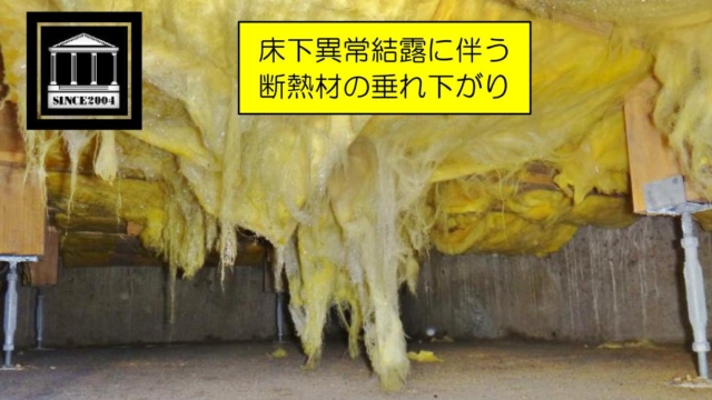 床下湿気に伴う断熱不具合事例 床下湿気が起因した断熱不具合発生事例写真です。 断熱材が結露水の影響により垂れ下がっている状態です。 木床構造にとって、極めて劣悪な環境であり、湿気発生原因の除去と劣化した断熱材の全面改修が必要です。Read More 床下断熱欠陥結露・カビ