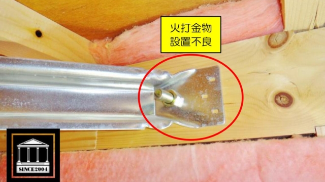 火打金物設置不良事例 火打金物HB設置不良事例写真です。 緊結部材である小型角座金と平釘ZF55での固定が不足しています。 水平構面強度を確保するために重要な部材であり、不適切な設置は、建築基準法違反となる場合があります。Read More 床構造欠陥