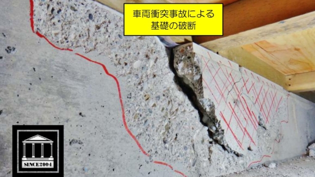車両衝突による基礎破損鑑定事例 交通事故により、住宅に自動車が衝突し基礎が破断した写真です。 基礎は外観上、被害は少ないと判断される状態でしたが、実際は衝撃波により建物床下内部側に大きく粉砕してる状況です。 特に、基礎外側断熱工法を…Read More 事故鑑定基礎欠陥