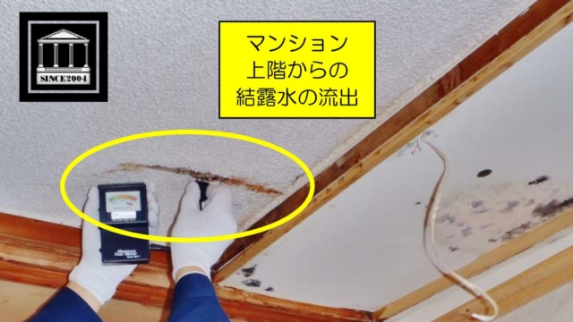 マンション上階からの漏水事例 マンション天井面からの漏水事例写真です。 マンション上階の結露管理不備が起因し、下階天面に流出している状態です。 無採暖・無換気の住空間では、異常結露が生じます。 床面コンクリートに滞留した結露水は、…Read More 漏水・浸水結露・カビ