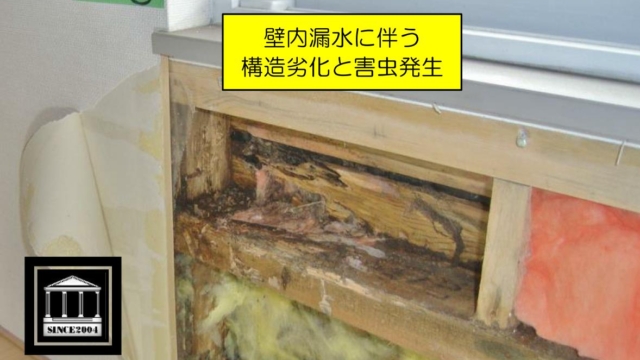 漏水による構造劣化・シロアリ事例 壁内漏水による構造劣化・シロアリ発生事例写真です。 一般的に外壁の室内側(石膏ボードの裏面)には気密シート(ポリフィルム等)が設置されています。 気密シートにより、壁内で水が長期滞留し、発見が遅れたこ…Read More 漏水・浸水結露・カビ防水欠陥