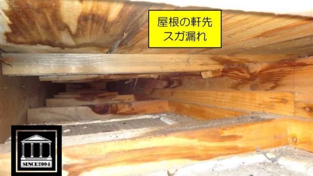屋根の軒先スガ漏れ事例 屋根の軒先「スガ漏れ」事例写真です。 防水性能が低い長尺蟻掛け葺きの場合、吊子設置部に融雪水が滞留した場合、板金裏面に浸水する可能性が高いです。 継続的なスガ漏れは、屋根構造部材に劣化が生じるため、改…Read More 屋根漏水・浸水結露・カビ防水欠陥