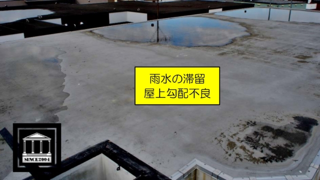 RC屋上の勾配不良事例 RC屋上の勾配不良に伴う雨水の滞留事例です。 経年劣化に伴うスラブの変動(タワミ)に伴い、排水勾配が適正に確保できていない状態であると推測します。 一般的なアスファルト防水の場合、雨水の滞留は機能上、…Read More 屋根構造劣化漏水・浸水防水欠陥RC構造欠陥
